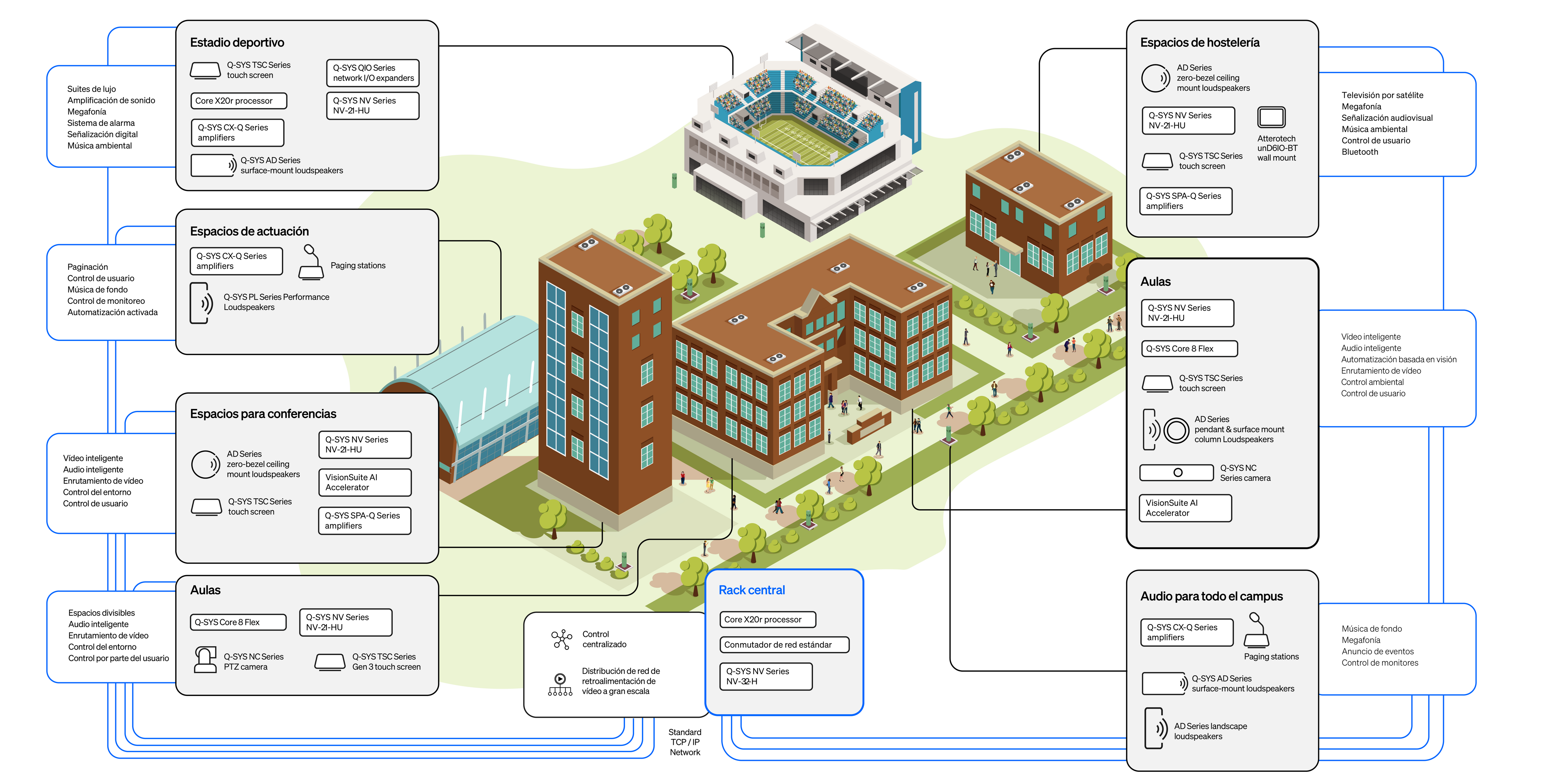 Agregue capacidades avanzadas de audio, video, control y monitore a aulas, salas de conferencias, teatros, y estadios sin sacrificar la usabilidad. Explore cómo Q-SYS admite: