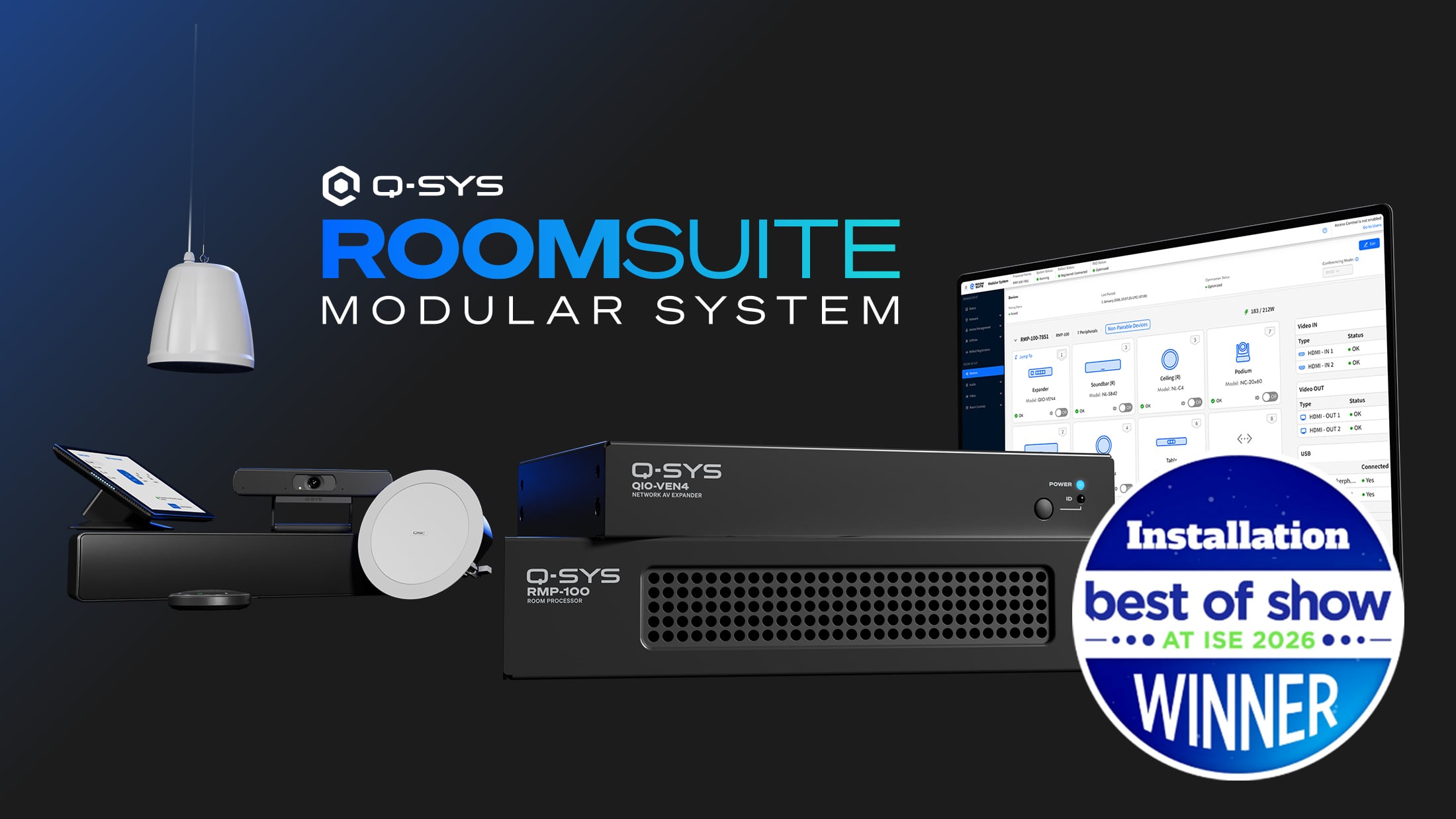 Dieser Gewinner des Best of Show Award auf der ISE 2026 stellt ein neues Hardware-/Software-Paradigma für Kollaborationssysteme dar, das speziell für die schnelle, standardisierte Inbetriebnahme in mittelgroßen bis sehr großen Räumen entwickelt wurde. Enthält den neuen RPM-100-Prozessor, die QIO-VEN4-Erweiterung und eine einfache webbasierte Konfigurations- und Inbetriebnahmemanagement-Anwendung.