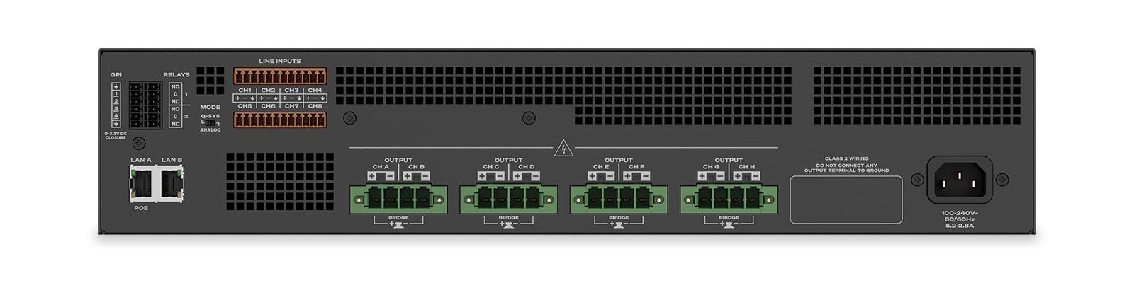 - Lo-Z, Hi-Z, 70 V und 100 V Direktantrieb auf allen Kanälen verfügbar (keine Überbrückung oder manuelle Umstellung erforderlich)