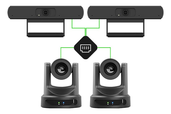 Die NC-Serie nutzt ein einziges Netzwerkkabel für die Übertragung von Video-, Strom- und Steuerungsdaten an Q-SYS und liefert das Video dann über USB an das vorgesehene UC-Compute. Durch die Nutzung der Leistungsfähigkeit des Netzwerks können Sie mit Q-SYS so viele Kameras der NC-Serie zu Ihrem System hinzufügen, wie Sie möchten.