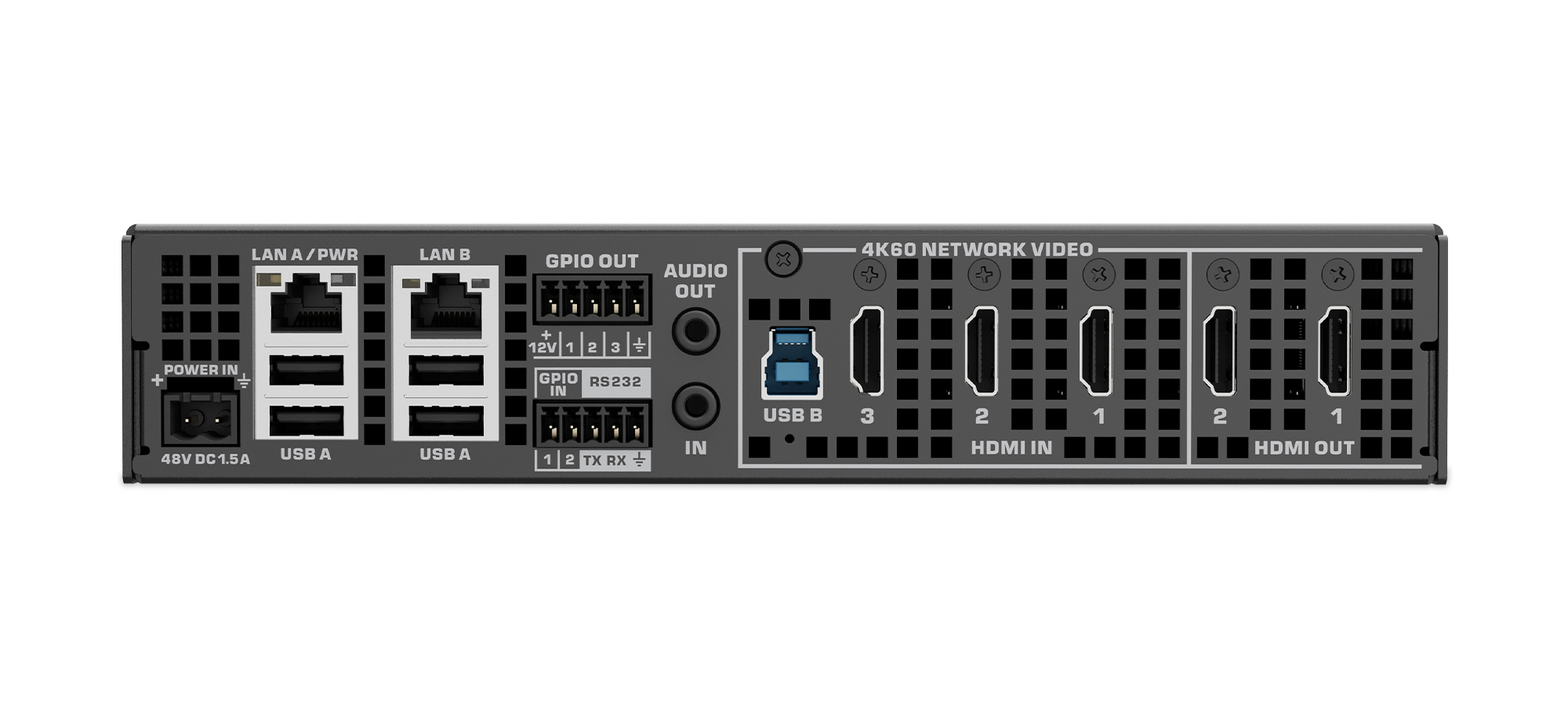 Rear view of a DPA Series power amplifier, a range of four-channel models with built-in DSP and flexible summing designed for cinema applications.