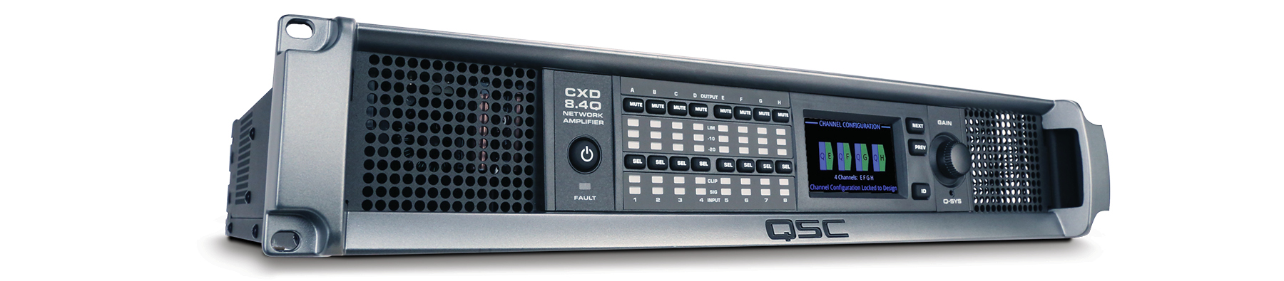 Vorderansicht links der vernetzten CXD8.4Q Endstufe.