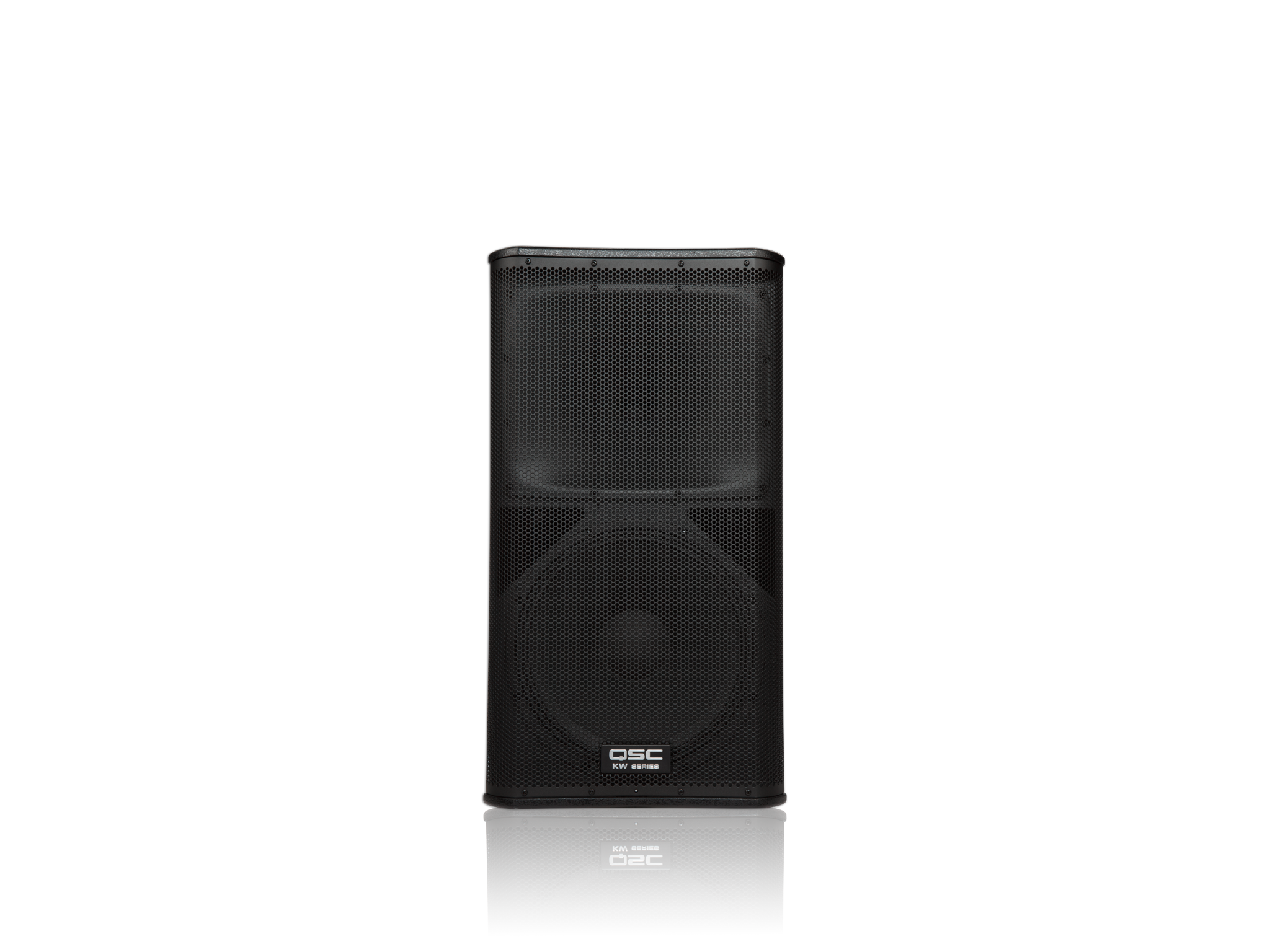 Front view of KW152 two-way powered loudspeaker for portable PA, mobile entertainers, musicians, etc.