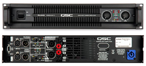 Front and rear views (small) of PL325 and PL340, high-performance two-channel power amplifiers with DataPort network interface.