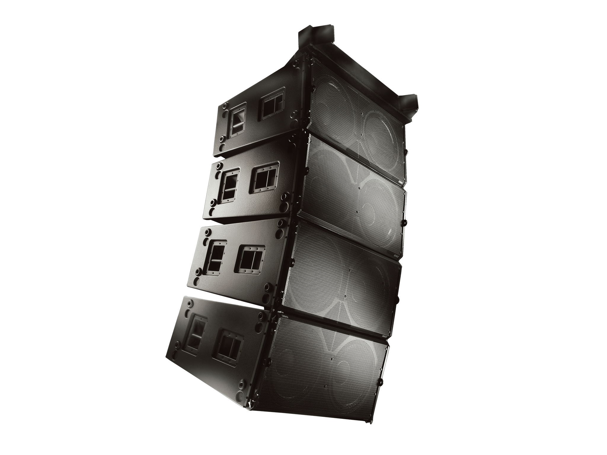 Angle view of a typical splayed hang of four WL2102-w enclosures, for touring and concert applications.