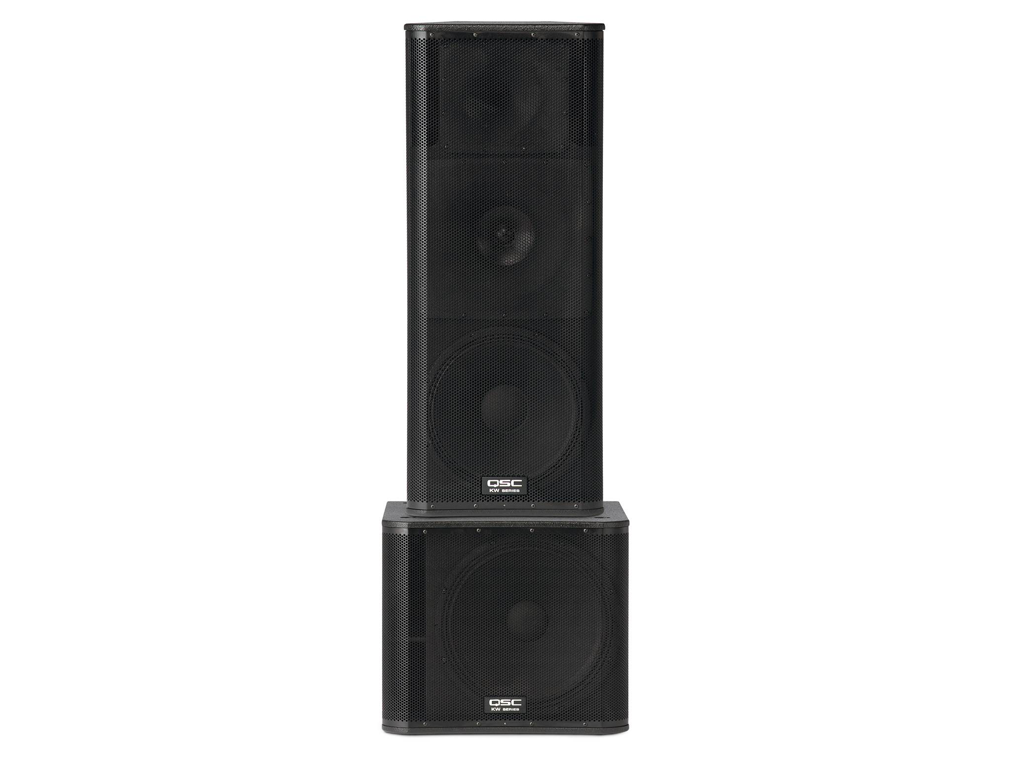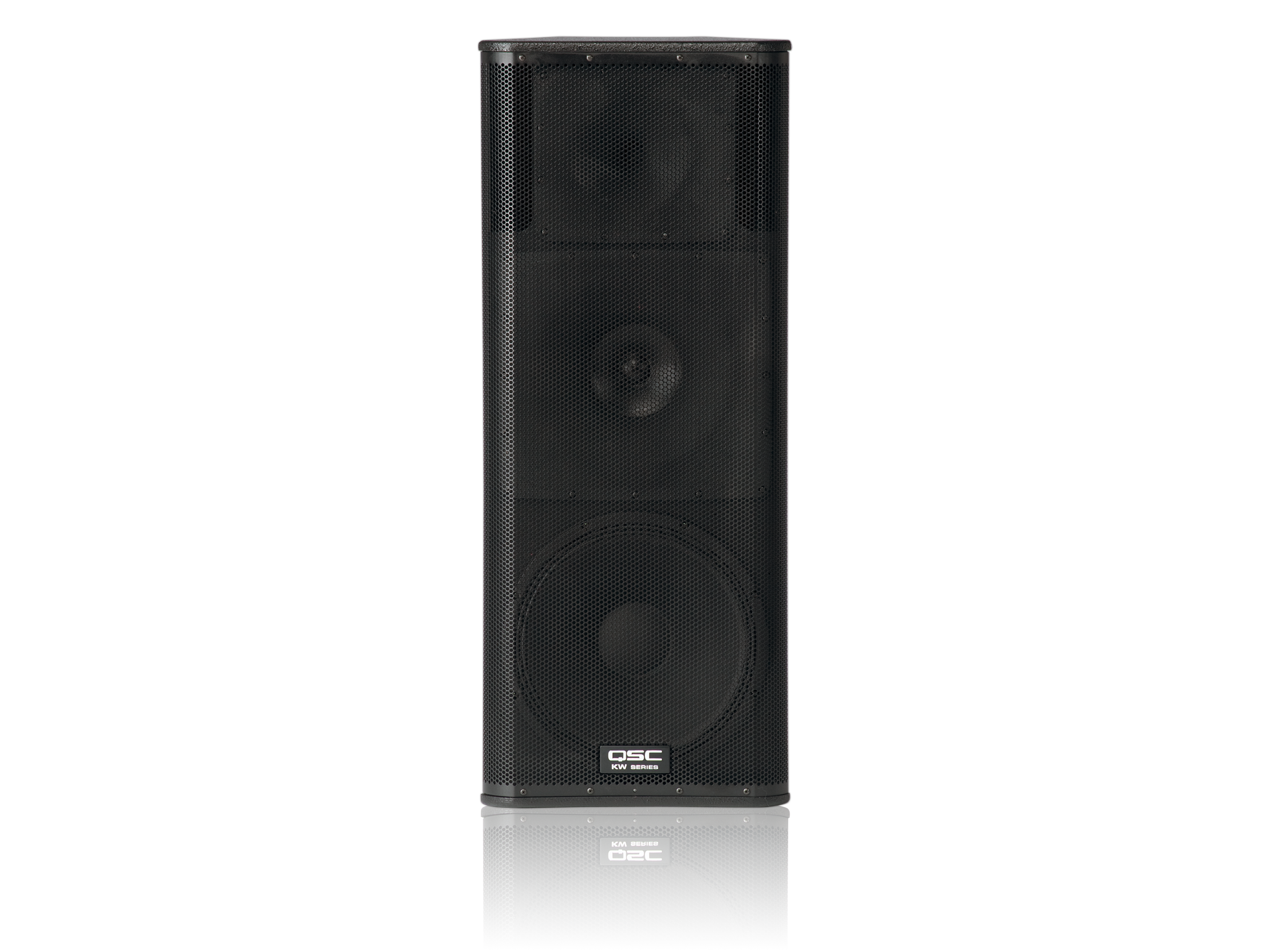 Front view of KW153 three-way powered loudspeaker for portable PA, mobile entertainers, musicians, etc.