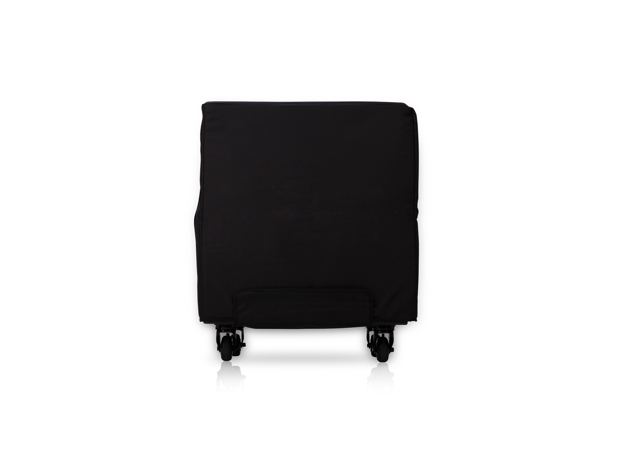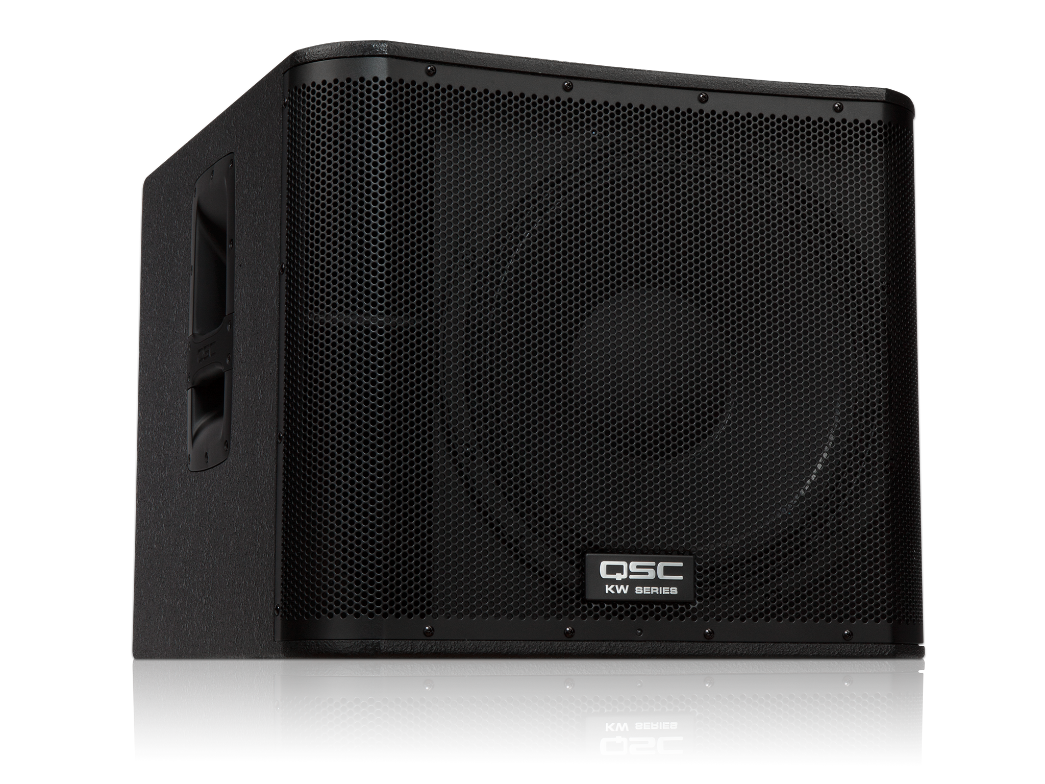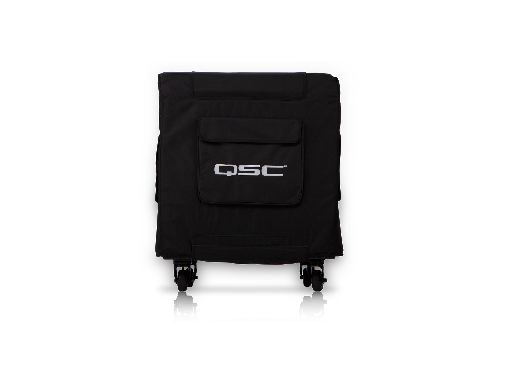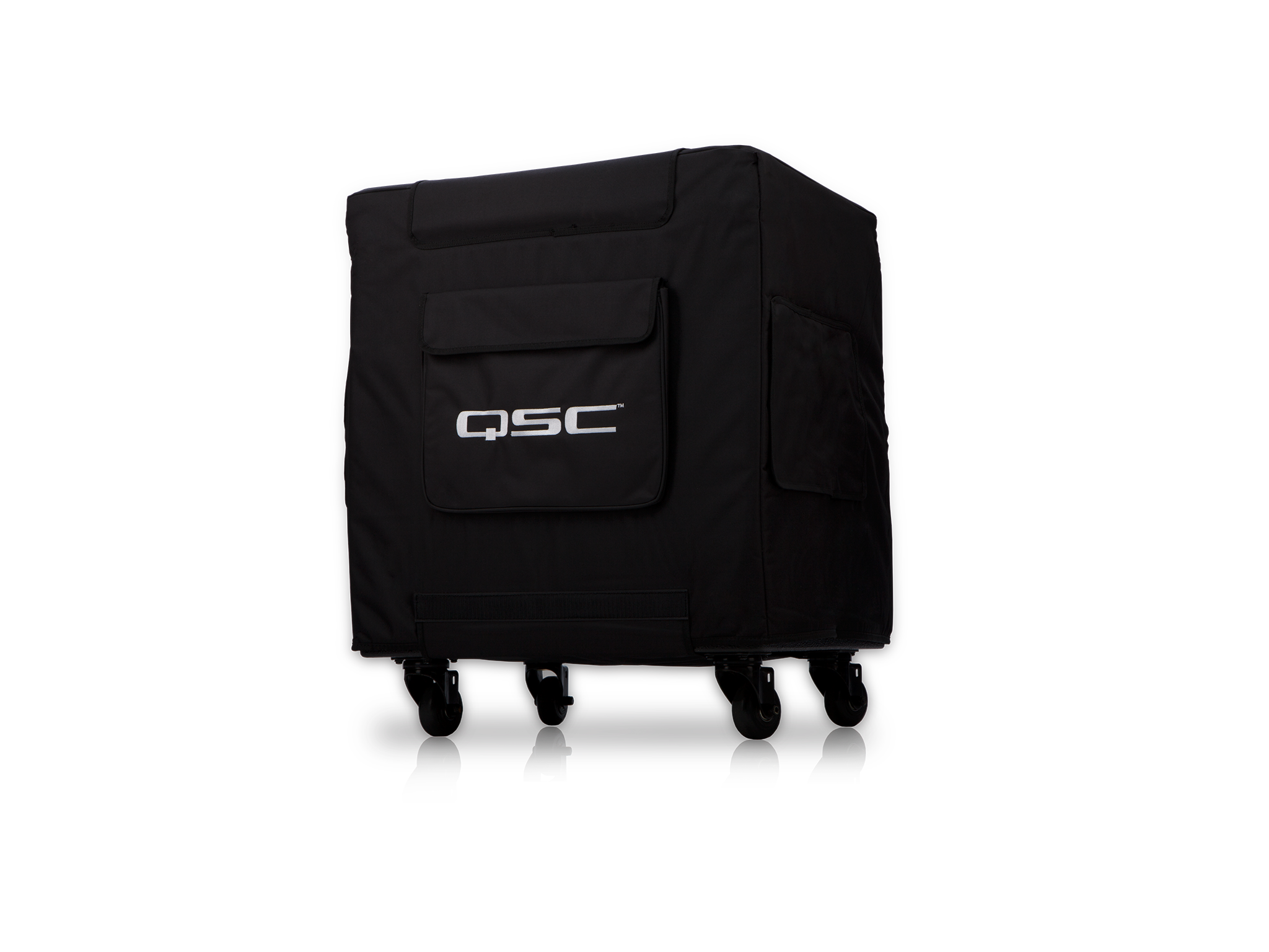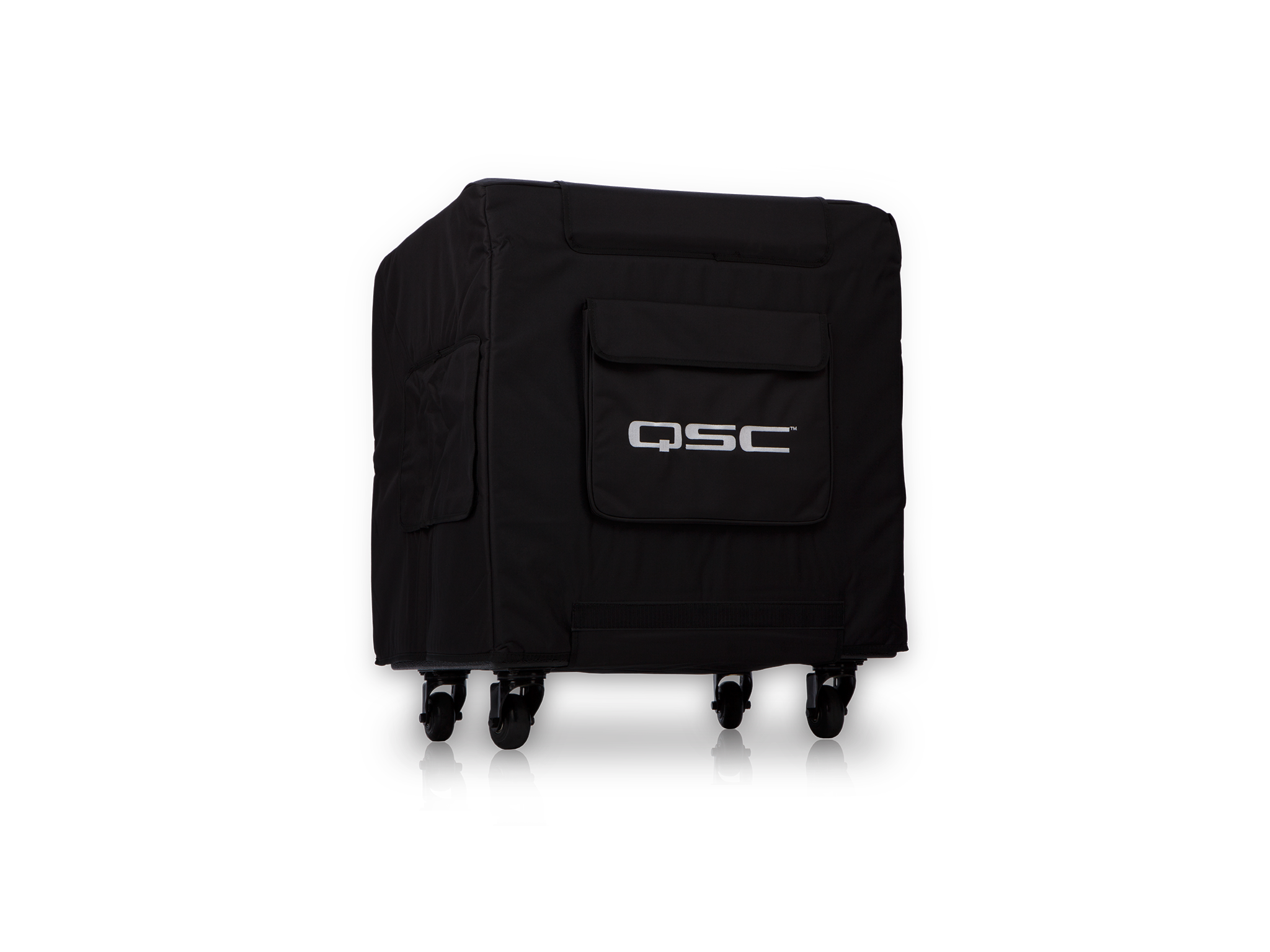 Logo side view of KW181 powered subwoofer in its accessory soft cover.