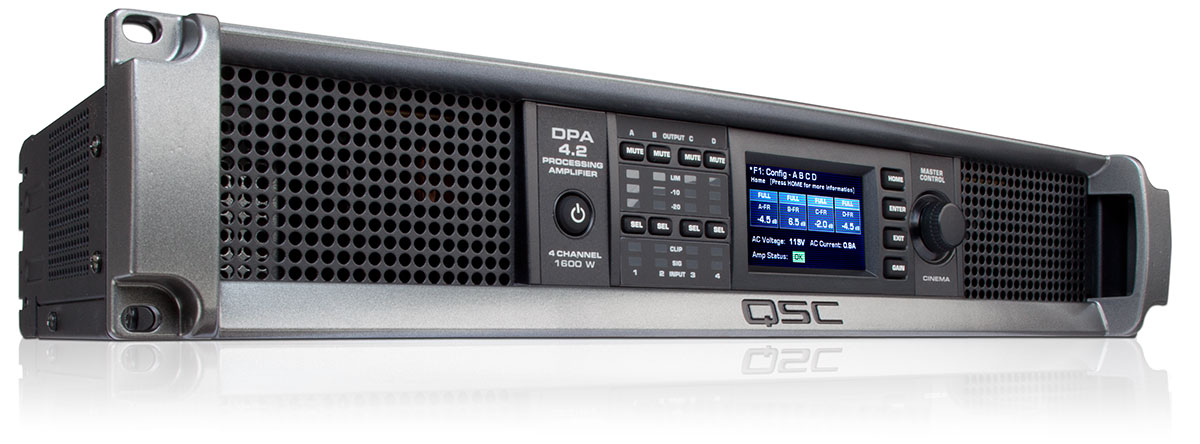 Front right view of the DPA4.2 power amplifier, a four-channel model with built-in DSP and flexible summing designed for cinema applications.