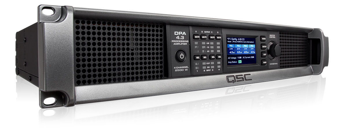 Front right view of the DPA4.3 power amplifier, a four-channel model with built-in DSP and flexible summing designed for cinema applications.