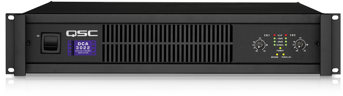 Frontansicht der DCA3022 Endstufe, eines Zweikanal-Modells, das für Kinoanwendungen entwickelt wurde