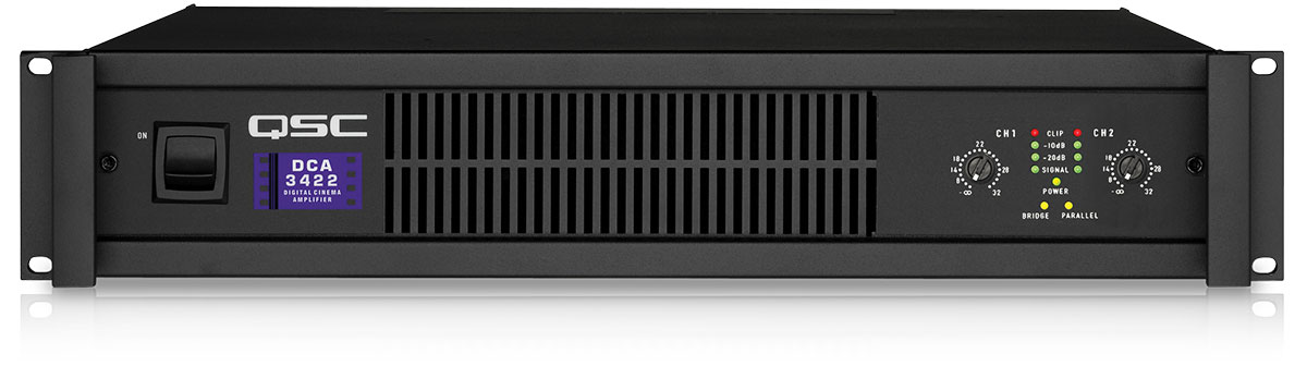 Front view of the DCA3422 power amplifier, a two-channel model designed for cinema applications.