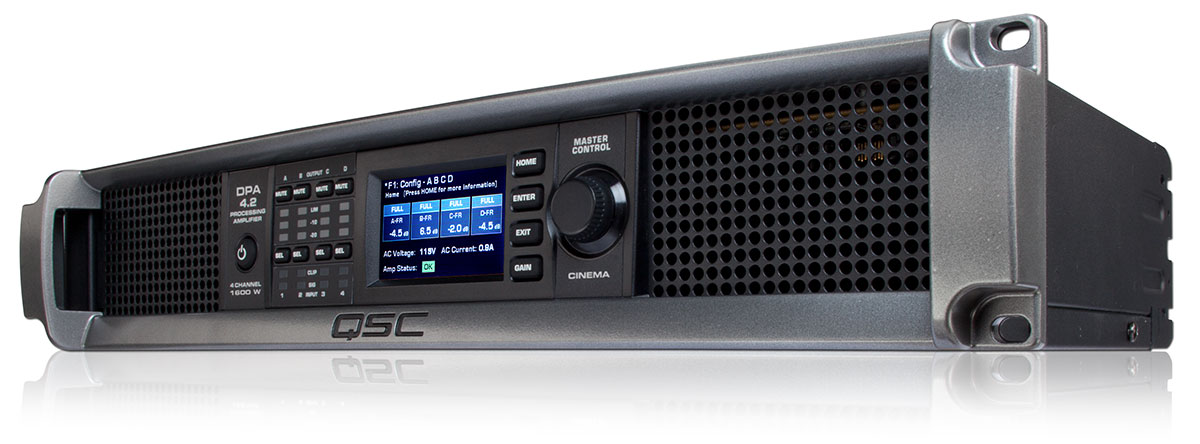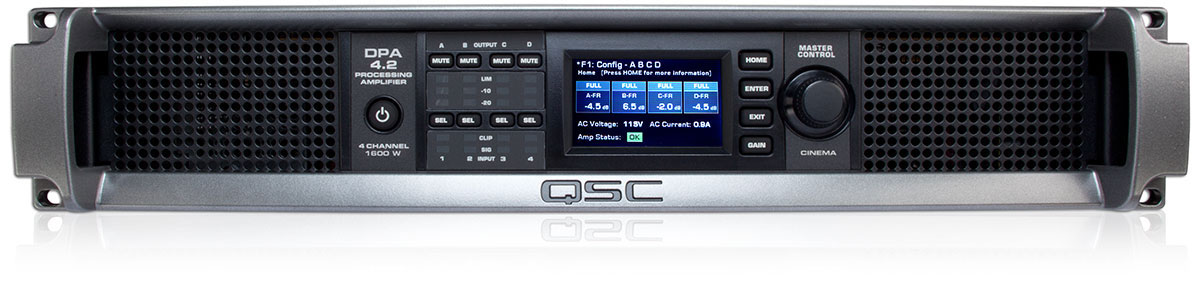 Front view of the DPA4.2 power amplifier, a four-channel model with built-in DSP and flexible summing designed for cinema applications.