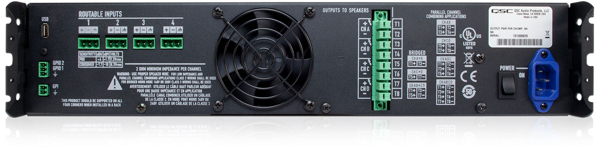 Rear view of the DPA4.2 power amplifier, a four-channel model with built-in DSP and flexible summing designed for cinema applications.