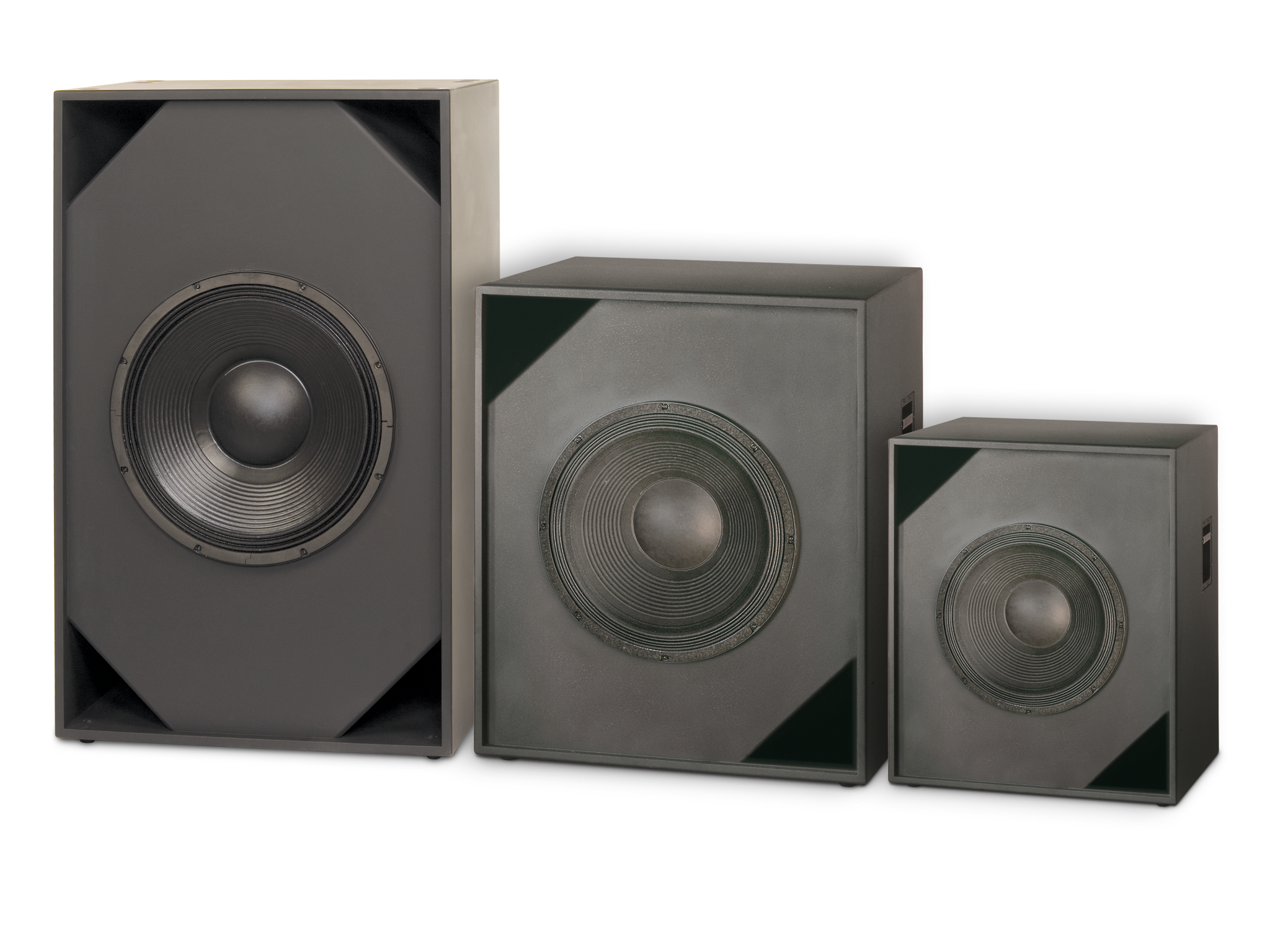 Angle view of three single-driver SB Series subwoofers for cineam sound.