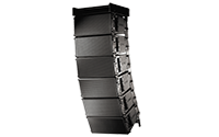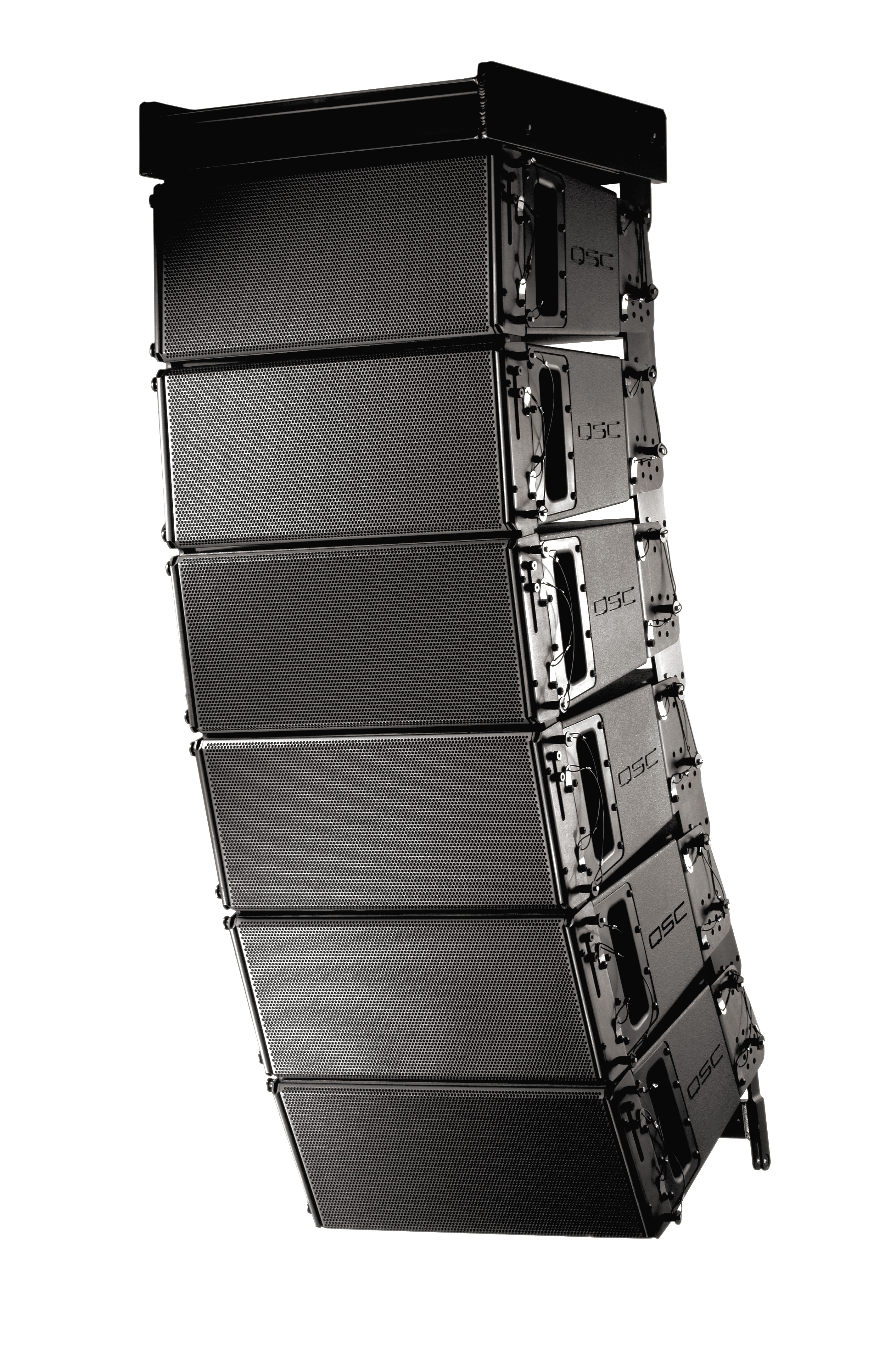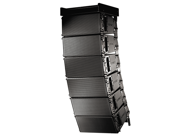 Angle view of a typical splayed hang of six WL3082 enclosures, for touring and concert applications.