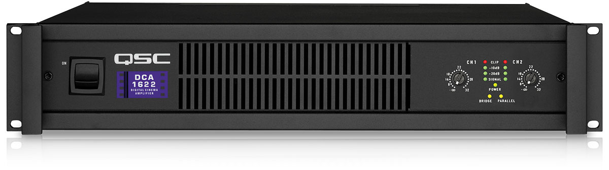 Front view of the DCA1622 power amplifier, a two-channel model designed for cinema applications.