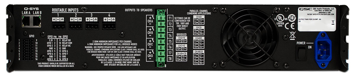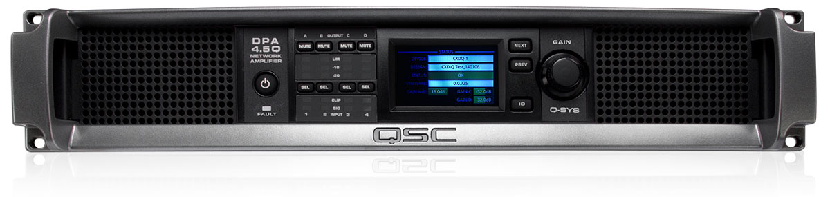 Front view (large) of the DPA4.5 power amplifier, a four-channel model with built-in DSP and flexible summing designed for cinema applications.