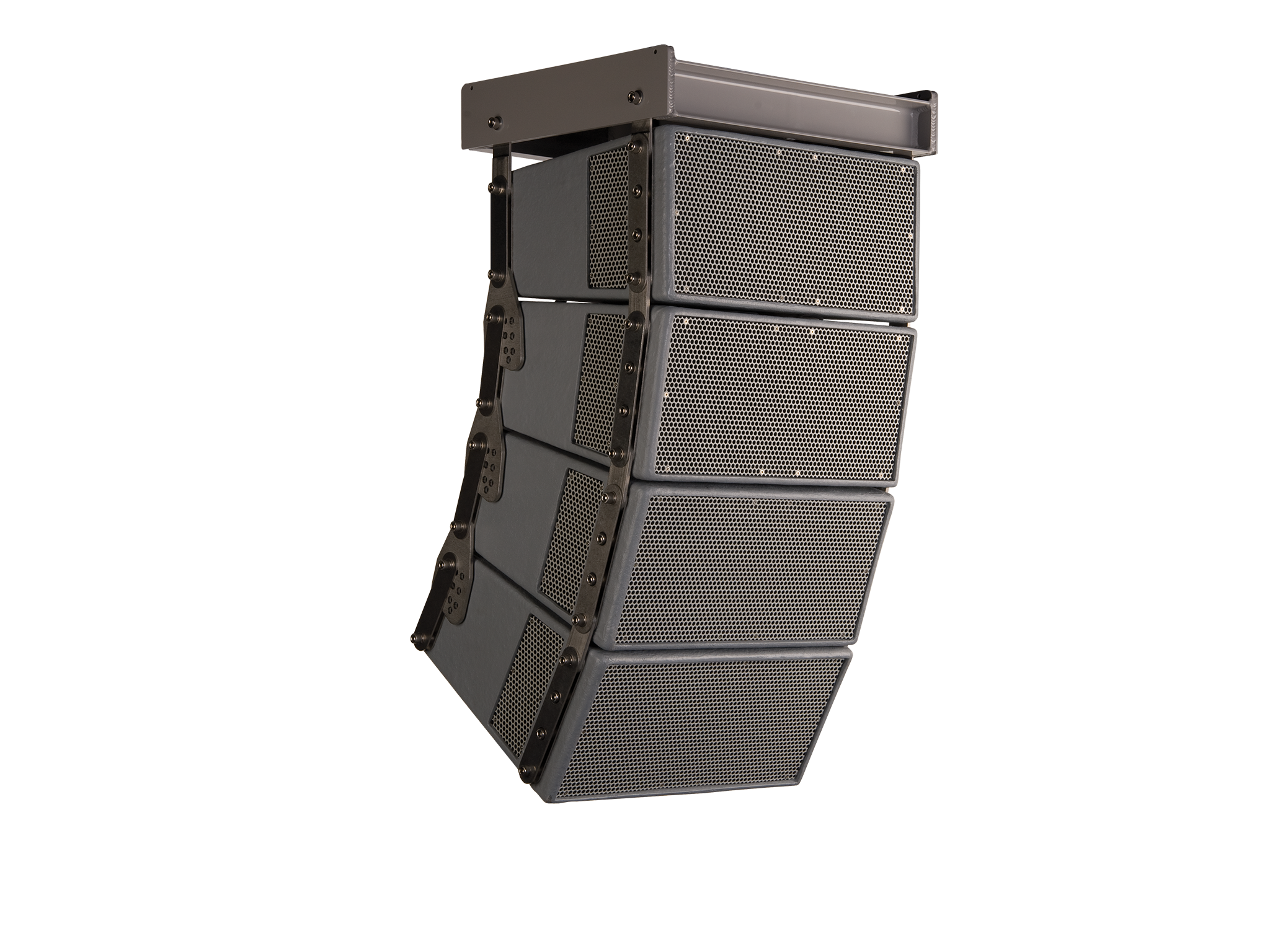 Angle view of a typical splayed hang of four WL3082 enclosures, for touring and concert applications.