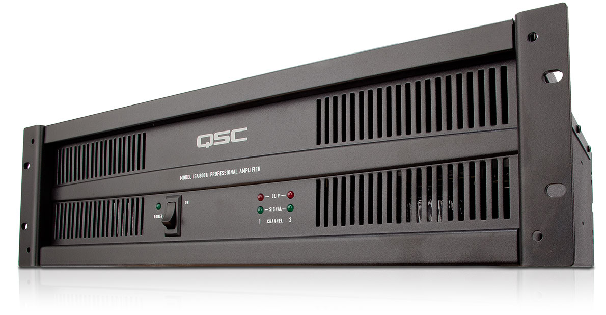 Front view of the ISA800Ti power amplifier, a two-channel value model with both low-Z and transformer-coupled 25V, 70V, and 100V isolated outputs. For contractors, installers, integrators, and cinema.