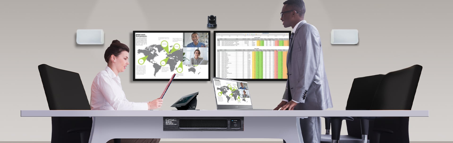 - QSC solves the most meeting room pains with native conference camera (Q-SYS PTZ-IP conference cameras) and video distribution technology (Q-SYS NV Series).